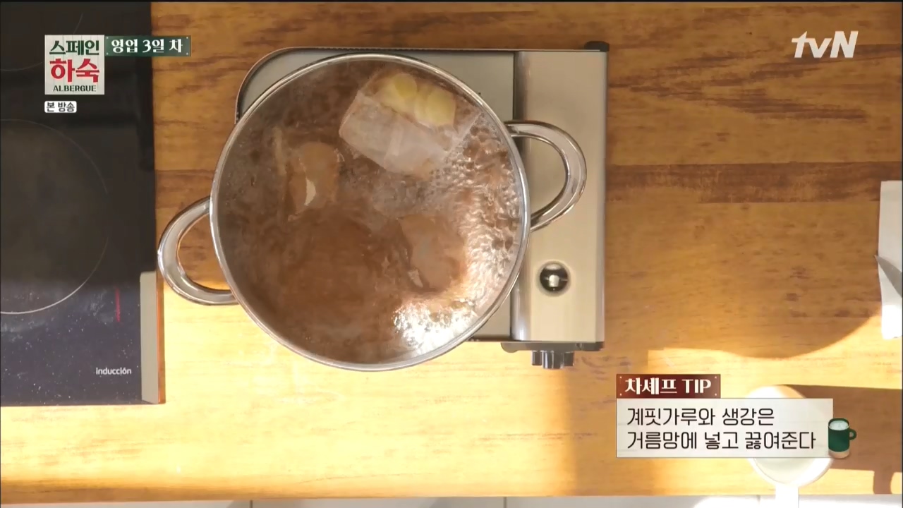 계핏가루와 생강은 거름망에 넣고 끓여줍니다.