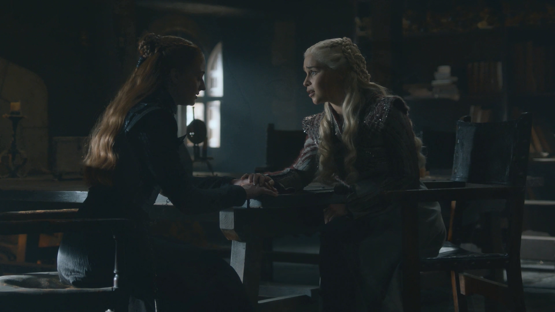 산사와 마주하게 된 대너리스는 제이미에 판결에 대한 의견이 자신과 비슷한 줄 알았는데라고 말하며 실망한 기색을 내비칩니다. 이어 산사는 브리엔은 항상 내게 충성했다고 누구보다 브리엔을 신뢰한다고 대답합니다. 이어 티리온도 좋은 사람이라고 말하자 대너리스는 나는 좋은 사람이라서 티리온을 수관 자리에 앉히게 아니라고 현명하기 때문에 앉힌 것이라고 말합니다. 티리온은 절대 서세 이를 믿으면 안 됐었다고 말하자 산사는 여왕님도 마찬가지라고 대답합니다.