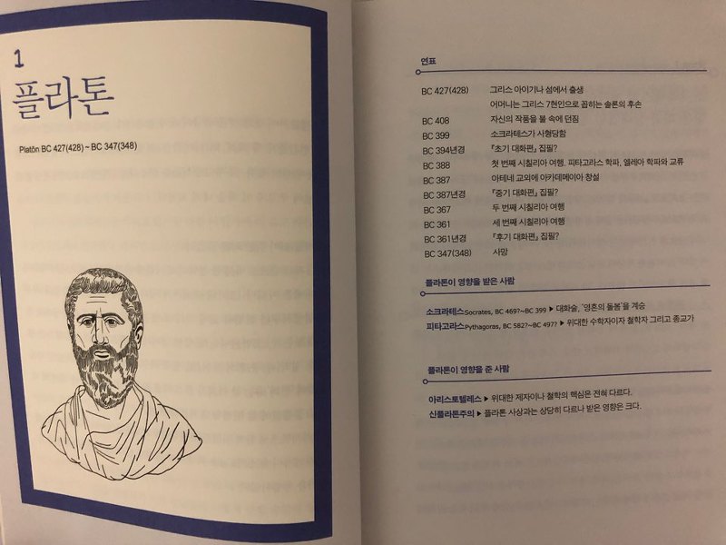 철학책 읽을 때 가장먼저 읽기 좋은 책입니다. 각 챕터마다 직관적으로 이해할수 있게 표와 이미지를 삽입했습니다. 또 각 챕터마다 핵심 포인트3가지를 선정하여 요약했습니다. 아래 이미지 처럼 철학자들의 출생부터 사망까지 연표를 통해 알수있게 설명 되어있습니다. 자신의 사상에 영향을 준 철학자와 영향을 받은 철학자들을을 소개합니다. 이 책의 장점은 철학사상을 굉장히 압축해서 핵심적인 요소만 다루었기 때문에 철학의 큰그림을 그리기가 좋습니다.
