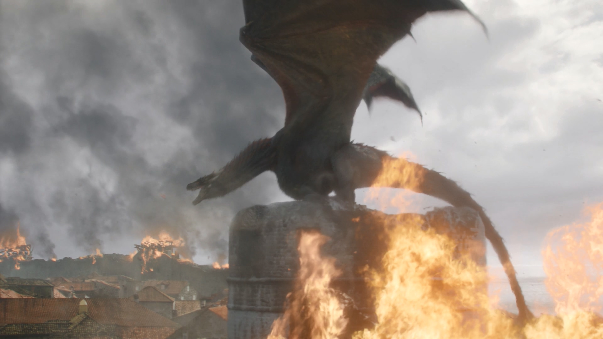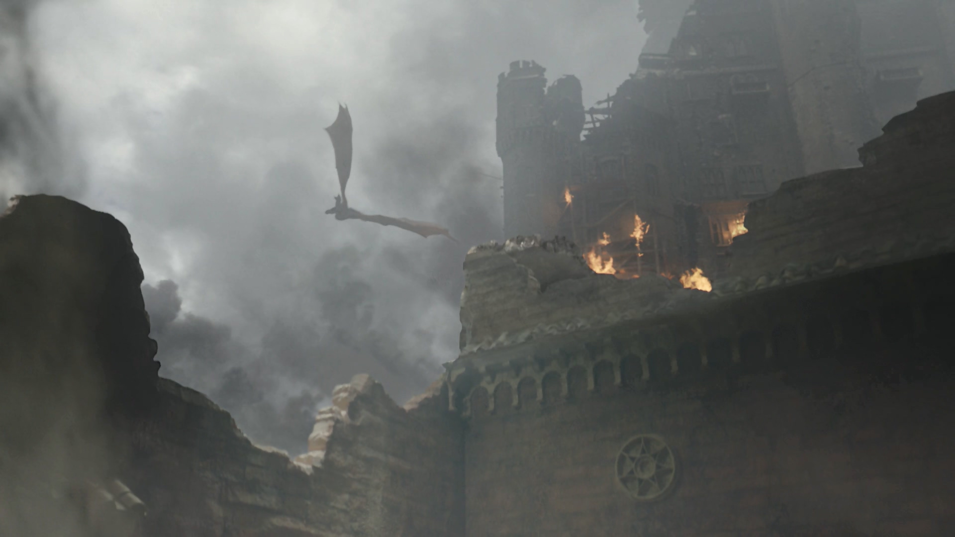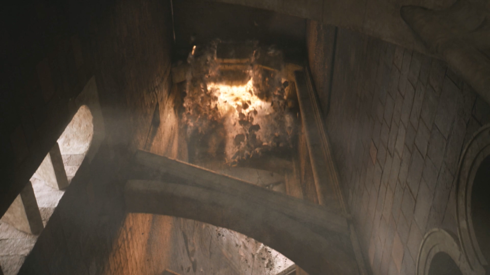모든 성벽이 무너지고 대너리스의 군대들이 킹스랜딩 안으로 진입하니다. 라니스터 군대와 마주하게 되고 서로를 주시하며 눈치 봅니다. 라니스터 군들은 결국 포기하고 들고 있던 검을 바닥에 내려놓고 두 손을 들어 항복했음을 보여줍니다. 그리고 킹스 랜딩에 종소리가 울려 퍼집니다. 도시의 항복을 의미합니다. 하지만 대너리스는 여기서 멈추지 않고 갑자기 다시 공격을 시작합니다. 마을은 더욱더 불바다로 변합니다. 대너리스를 본 대너리스 군대들도 무참히 킹스 랜딩의 시민들을 학살하기 시작합니다.