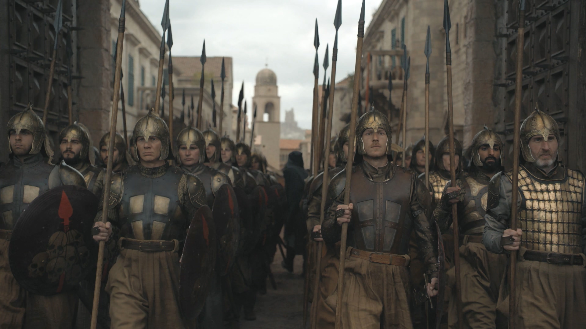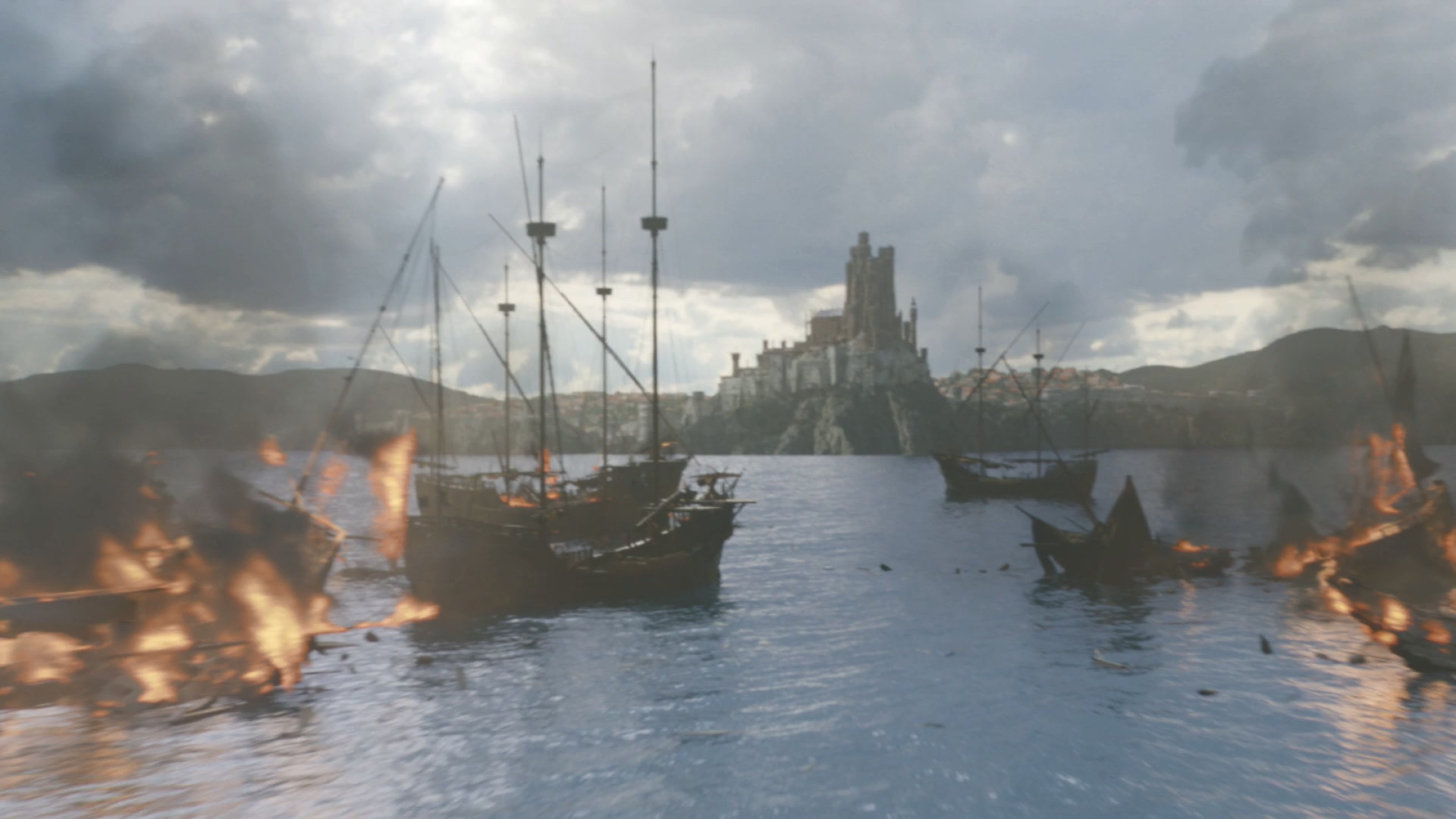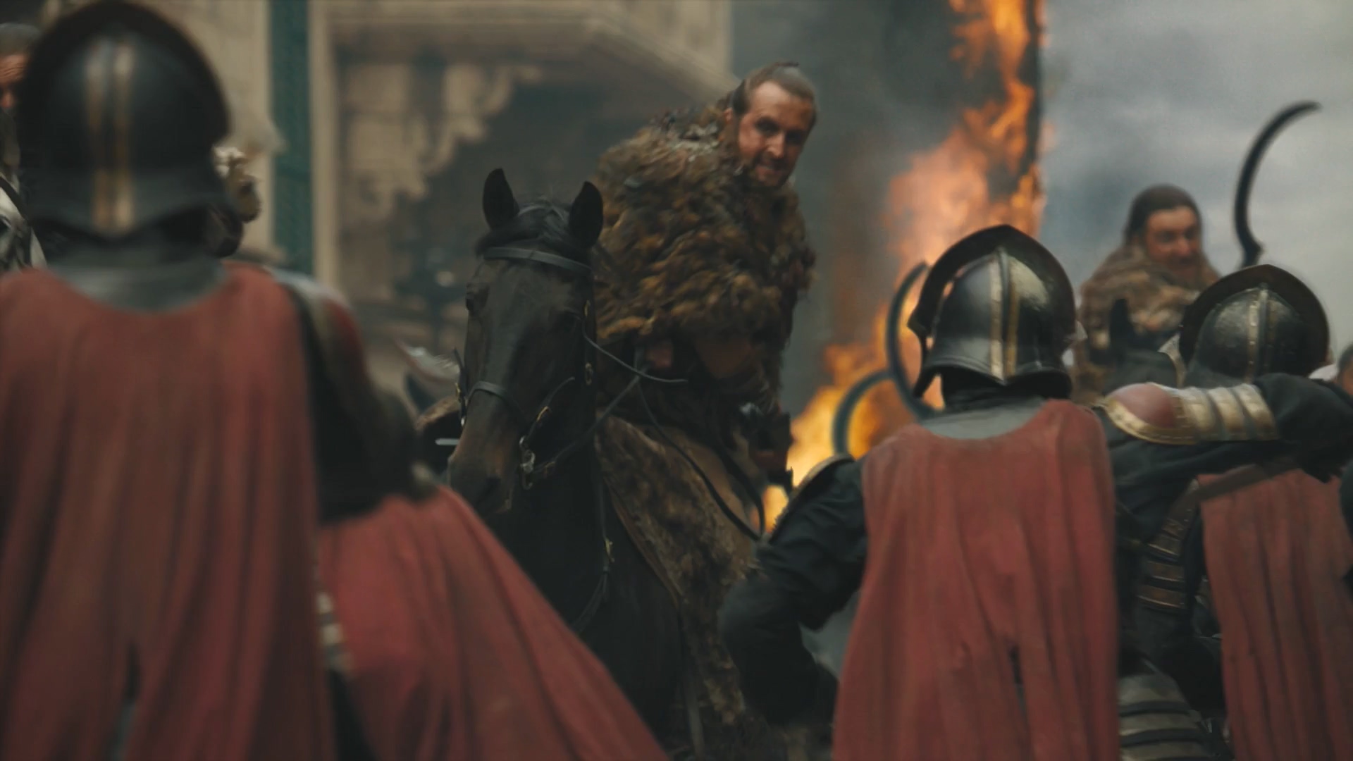 모든 성벽이 무너지고 대너리스의 군대들이 킹스랜딩 안으로 진입하니다. 라니스터 군대와 마주하게 되고 서로를 주시하며 눈치 봅니다. 라니스터 군들은 결국 포기하고 들고 있던 검을 바닥에 내려놓고 두 손을 들어 항복했음을 보여줍니다. 그리고 킹스 랜딩에 종소리가 울려 퍼집니다. 도시의 항복을 의미합니다. 하지만 대너리스는 여기서 멈추지 않고 갑자기 다시 공격을 시작합니다. 마을은 더욱더 불바다로 변합니다. 대너리스를 본 대너리스 군대들도 무참히 킹스 랜딩의 시민들을 학살하기 시작합니다.