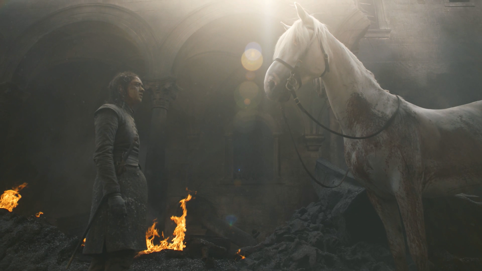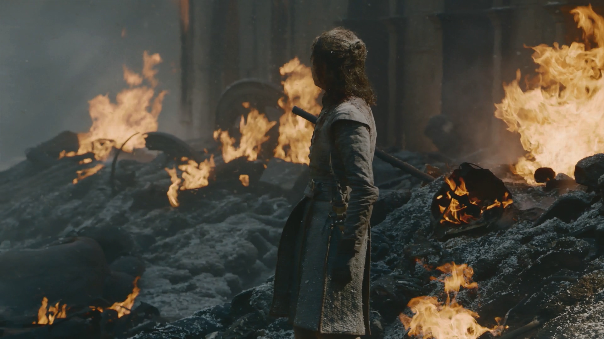 결국 제이미와 서 세이가 만납니다. 그리고 대너리스의 공격에 무너진 건물 더미에 깔려 사망합니다. 아리아는 불타는 도시에서 죄 없는 수많은 시민들이 죽어가는 것을 봐왔습니다. 그리고 아리아는 가장 충격적인 장면을 마주합니다. 엄마가 딸을 지키기 위해 감싸 안고 불에타 잿더미가 된 모습을 본 것입니다. 이에 아리아는 무언가 결심한듯한 표정으로 말에 올라탑니다.