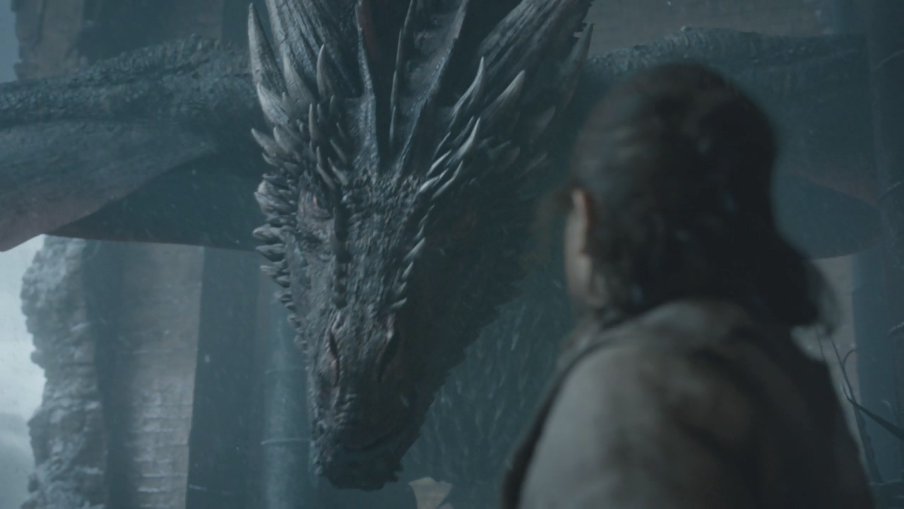 결국, 존스노우는 대너리스와 키스 도중에 숨겨둔 단검으로 찔러 죽이고 흐느껴 웁니다. 그때 용이 날아오고 마치 주인 잃은 개가 울듯 낑낑대며 울다가 분노에 찬 표정으로 존스노우를 바라봅니다. 드로곤은 존스노우를 바라보며 크게 입을 벌려 불음 뿜을 준비를 합니다. 드로곤은 불을 뿜는 순간 고개를 돌려 '철 왕좌'를 녹여버립니다.