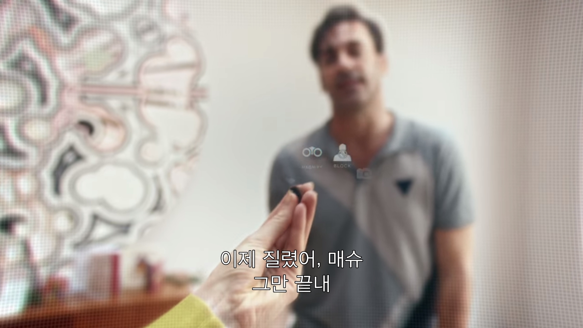 그럼 그 토스트를 떠올리며 제어버튼을 눌러보라고 지시합니다. 그러자 그녀가 떠올리며 버튼을 누릅니다. 매슈는 그게 바로 당신이 담당해야 할 일이라며 조명, 알람은 아침 몇 시에 울릴지, 냉장고에 음식이 없으면 주문해야 한다고 말합니다.