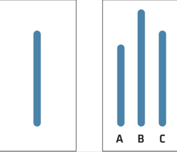 애쉬는 실험 참가자를 약 7명에서 9명 정도 되는 집단으로 나눠 배치했습니다. 그리고 2개의 카드에 표시한 수직 직선의 길이를 맞추는 검사를 했습니다. 첫 번째 카드에는 1개의 직선을 그려 놓았고, 두 번째 카드에는 아래 그림의 오른쪽같이 3개의 직선을 그렸습니다.