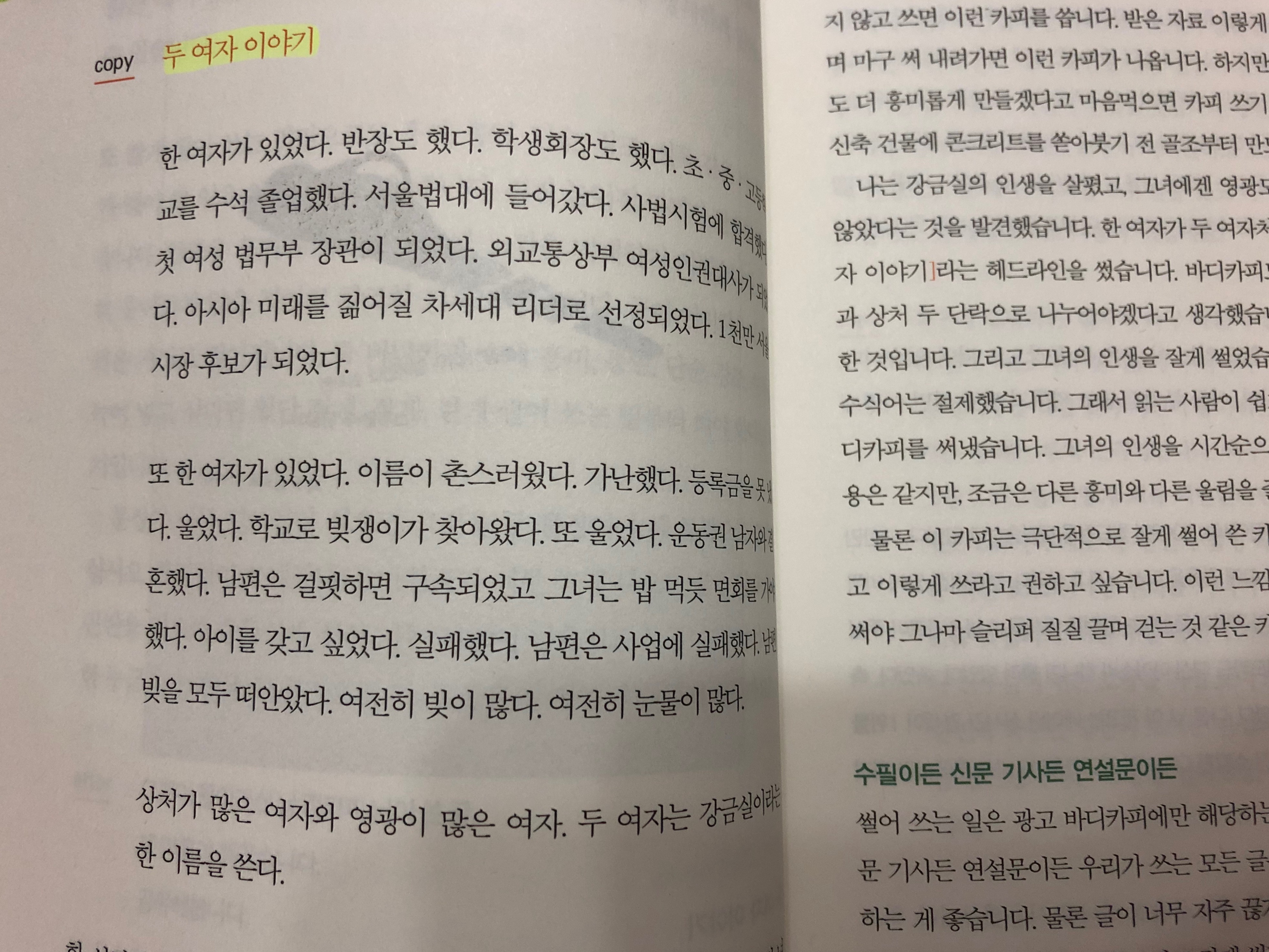 짧은 문장이 툭툭 이어질 때 읽는사람이 부담을 갖지 않습니다. 저자는 2006년 서울시장 선거 때 강금실 후보 카피를 썼습니다. 그때 저자가 썼던 카피중 그녀의 인생을 소개한 [두여자 이야기]를 예시로 얼마나 잘게 썰어야 하는지 보여줍니다.