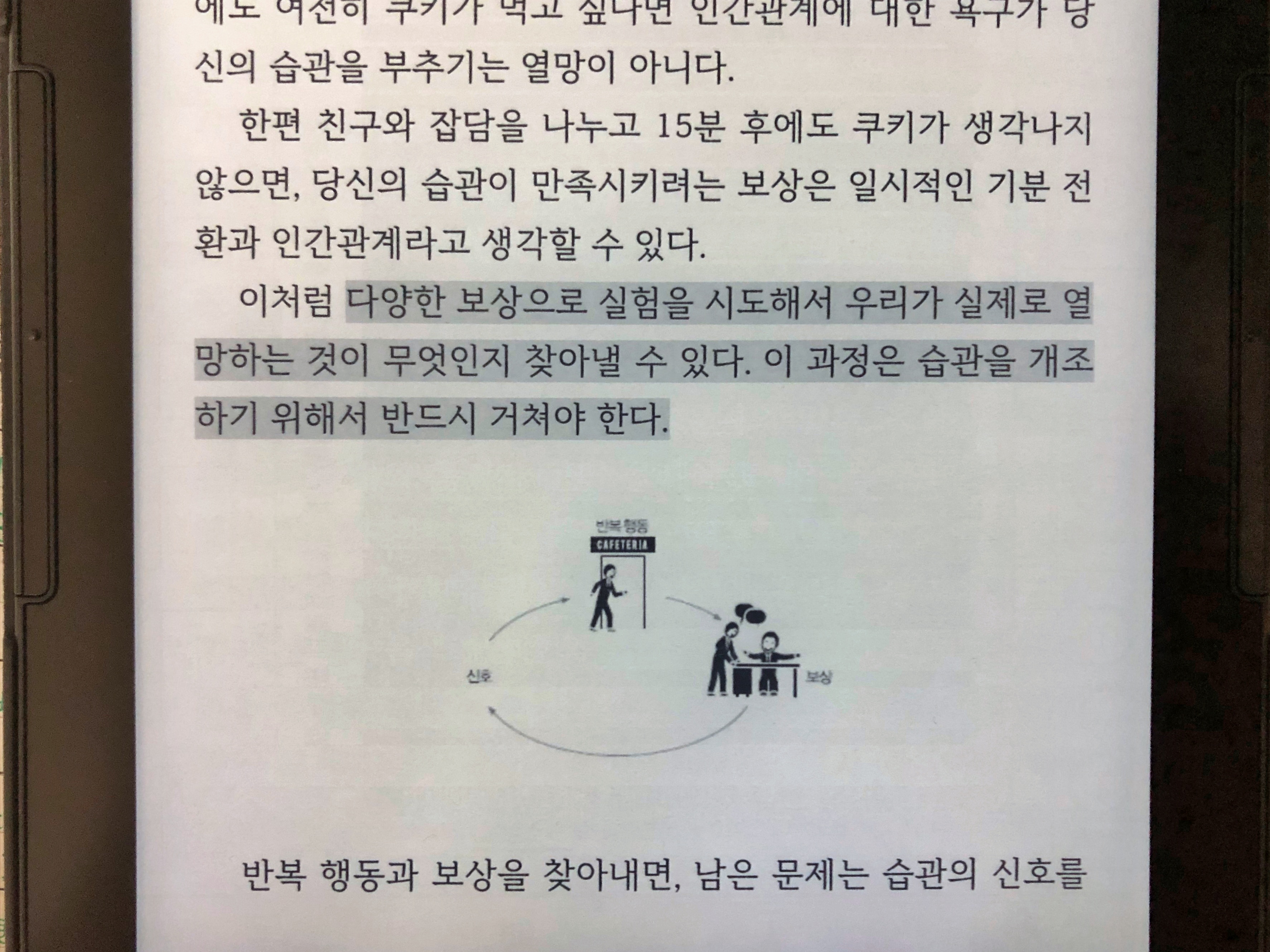 하지만 열망하는 마음이 없다면 습관이 되지 않는다. 앞에서 말했듯이 습관은 신호-> 반복행동-> 보상으로 이어지기 때문에 독서 후 보상, 운동 후 보상이 있어야만 습관이 된다. 스스로 그 행동을 하고 만족할만한 보상을 줘야 한다. 예를 들면 책을 읽겠다는 계획을 잘 실행하면 맛있는 커피를 마신다던가 좋아하는 영화 한 편을 본다던가 하는 방식이다.