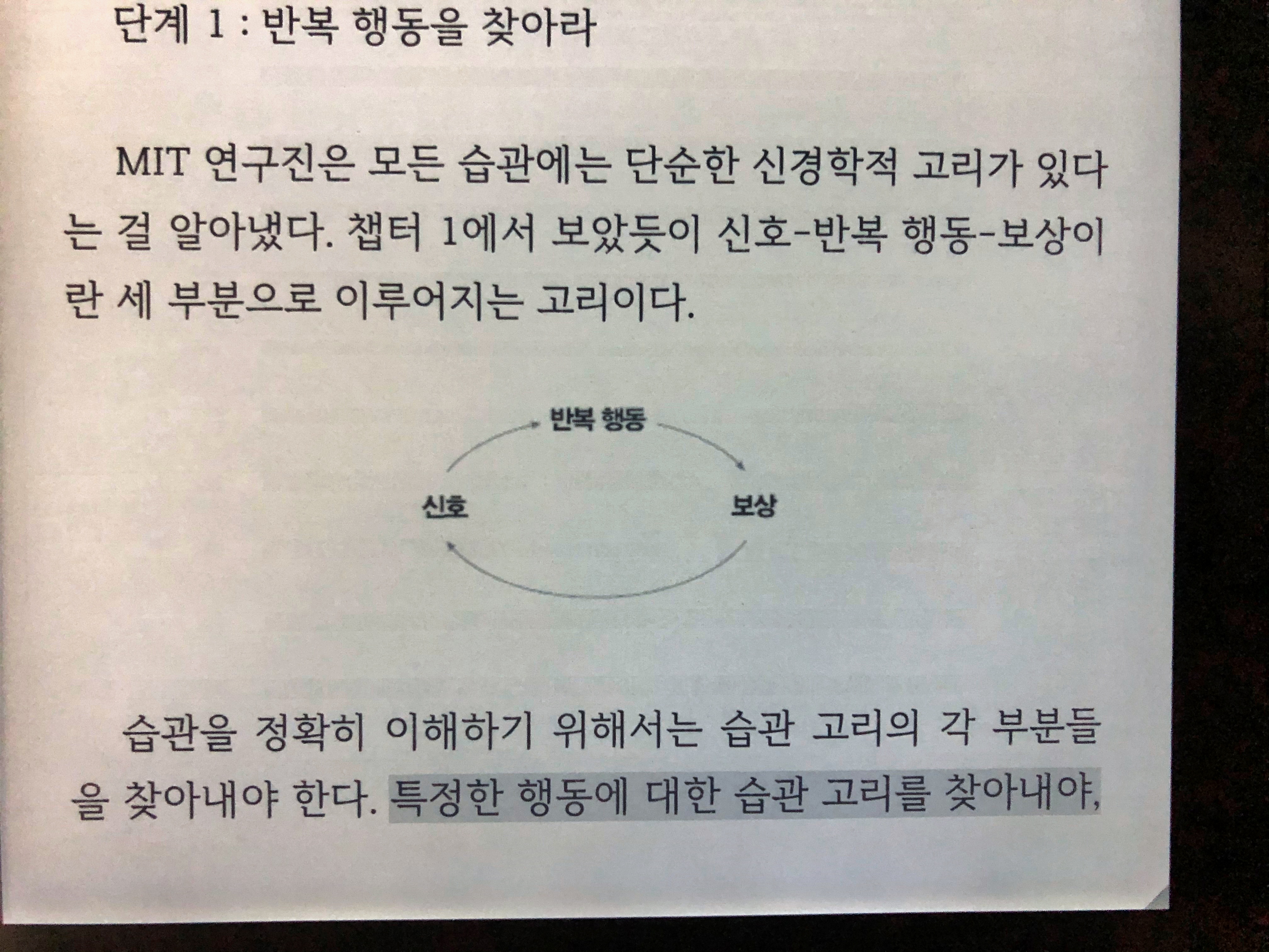 습관은 신호-> 반복행동-> 보상으로 이어진다. 예를 들면 배가 고프면 무언가를 먹고 싶다는 열망이 생긴다. 열망은 곧 무언가를 먹으라는 신호로 바뀌게 되고 행동하게 만든다. 그 이후 맛있다던가 배가 부르다는 보상으로 이어지게 된다. 이것이 반복되면 흔히 습관이라고 부른다.